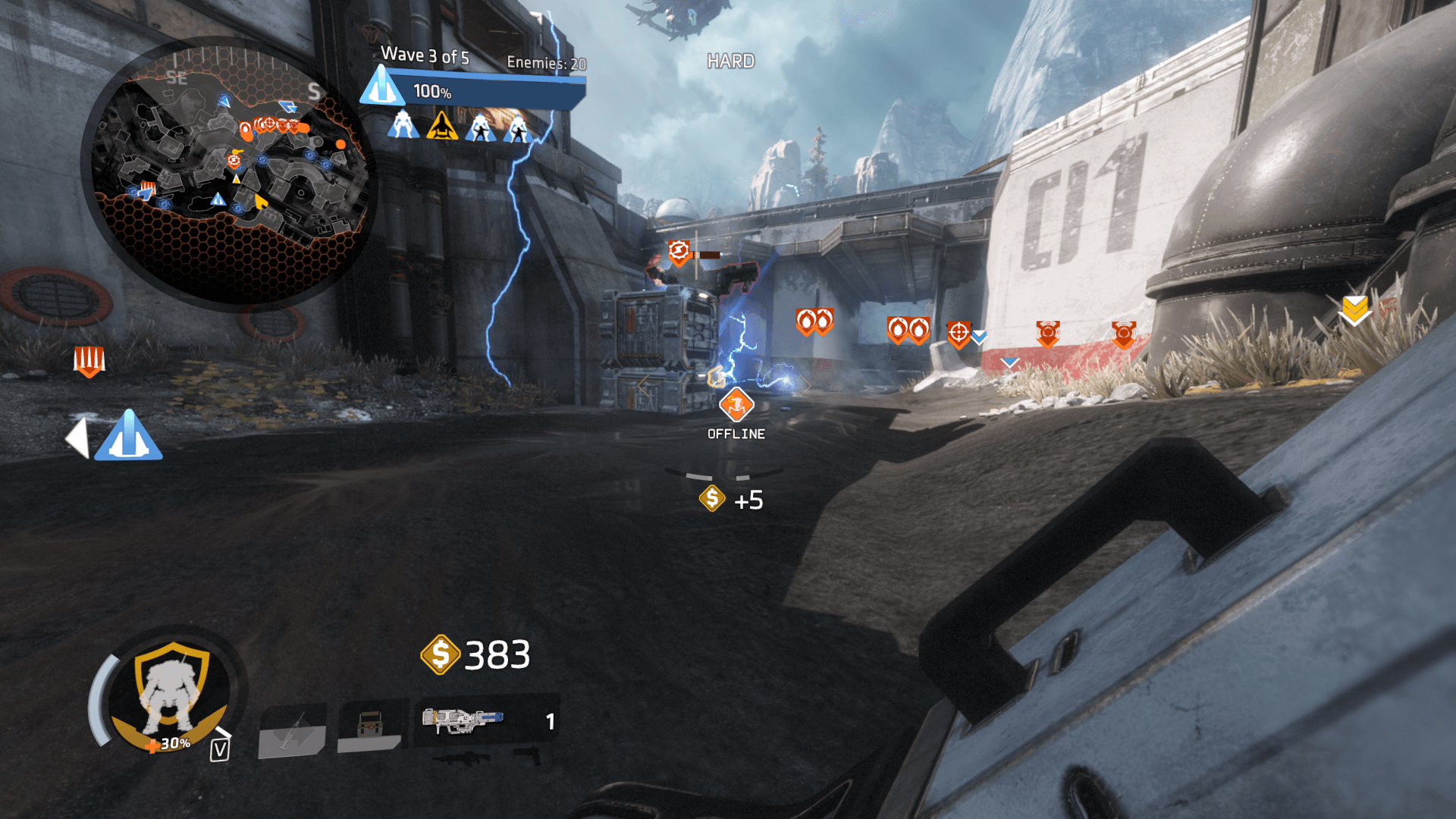 Once deployed on the map Arc titans run to the harvester in determined paths. Arc titans will use leadwall on distanced targets like pilots, and will use broadswords on any nearby pilot or Titan. Will throw arc waves when nearby militia forces or harvesters. Arc titans will use sword blocks to defend against attacks, especially lock-on weapons. Phase dash is an ability they will use to dodge cores and other dangerous abilities. Arc titans have a unique arc field passive that they will purposely use against harvester.