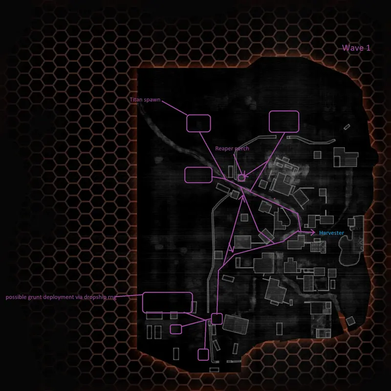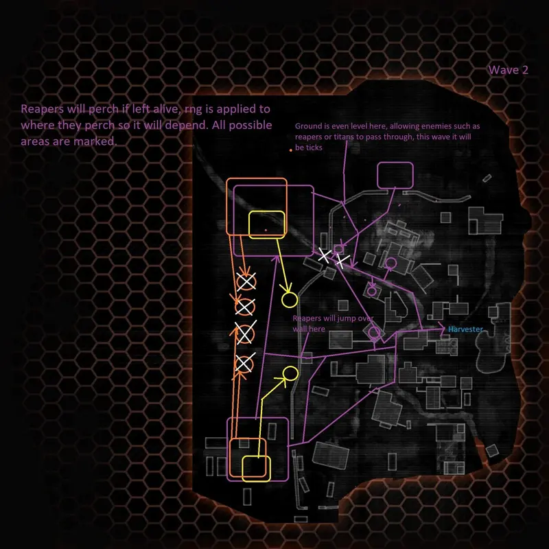 Wave 1 begins with map smoke deploying on the 3 main entrances, these entrances are at off-angle right, deep mid, and deep left. Grunts will begin to spawn out of dropships or drop pods in each of the areas behind the smoke, soon after a Legion titan will spawn in deeper mid, it will make its way towards the harvester via mid and short mid pathway. This titan is a good choice to farm batteries, but don’t be worried if it dies, as there is another random titan that will spawn in the exact same area again later in the wave. Stalkers will soon appear after the 2nd deployment of grunts, so extreme caution will be needed. Wave 1 has a lot of stalkers, so it is recommended that pilots use sniper rifles and grenade launchers. Stalkers can be unpredictable and can shoot a pilot through the map smokes, so be very careful. As shown in the illustration, some grunts will take off at angles, so keep this in mind. Once the smoke dissipates, reapers will begin to spawn in deeper left and off-angle right. Kill the reapers to prevent possible perching, as ticks will make everything way more dangerous. Once most of the enemies are dead, a second titan should be making its way to the harvester. Use this opportunity to get a battery, but always make sure the harvester isn’t touched.