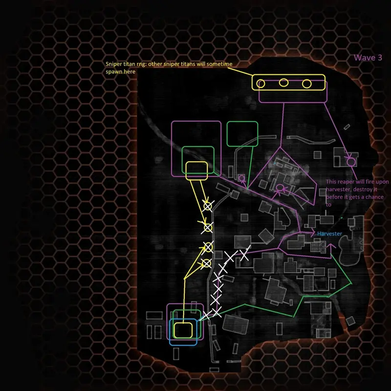 Wave 3 is a bit easier as there are no more mortar titans, so all arc traps placed for mortars should now be picked up and placed elsewhere. This wave will now have the majority of titans go towards the deep left choke versus the deep mid choke. Arc traps should be placed in the deep left choke point and all of the sniper titan locations to make the sniper titans much easier to deal with. Titans that go through the deep left choke will head towards the harvester in the left lane that then leads on to the short left or short mid, they will either split up or go down one of the paths, this can be incredibly tedious to deal with so prevent this scenario from happening all together by having one or two pilots hold the deep left chokepoint while inside the map deployed smoke. The other two pilots will have to do pest control as plasma drones will spawn on this wave. They will, as shown on the map, spawn in deep mid, deep left, and off-angle right. Some drones will also go on the off-angle left side. So to start this wave will have large number of titans and reapers that spawn in in the areas of deeper mid and deeper left, additionally 5 reapers will warpfall in deep right, these reapers will then proceed to climb onto perched areas, make sure these reapers die as soon as possible or else ticks and reaper rockets will be fired upon militia forces, one particular reaper will actually fire upon harvester so he must die, he perches on top of the right side building, it’s important to remember that some reapers will vault over the wall that separates the two parts of the map so don’t get surprised. In the meantime, sniper titans, Ion, Tones, Legion, Monarch, and Ronin titans will begin to stride to the harvester via the deep left checkpoint soon after the first portion is destroyed 2 arc titans will spawn deeper left; they will go towards the harvester like the rest of the titans. Lastly, another wave of enemies comes along, which will have a nuke titan or two in it, so whoever is holding the choke will need to keep that in mind. Also, the map deployed smokes do not last forever; be extremely careful so as not to be in a scenario where you are out of electric smoke and are surrounded by enemy titans. As long as the deep left is held, this wave should be very easy. Something worth mentioning about the sniper titans is that they will sometimes spawn in the deeper right side and will stay there; these are good battery/titan meter farming for those who dare.