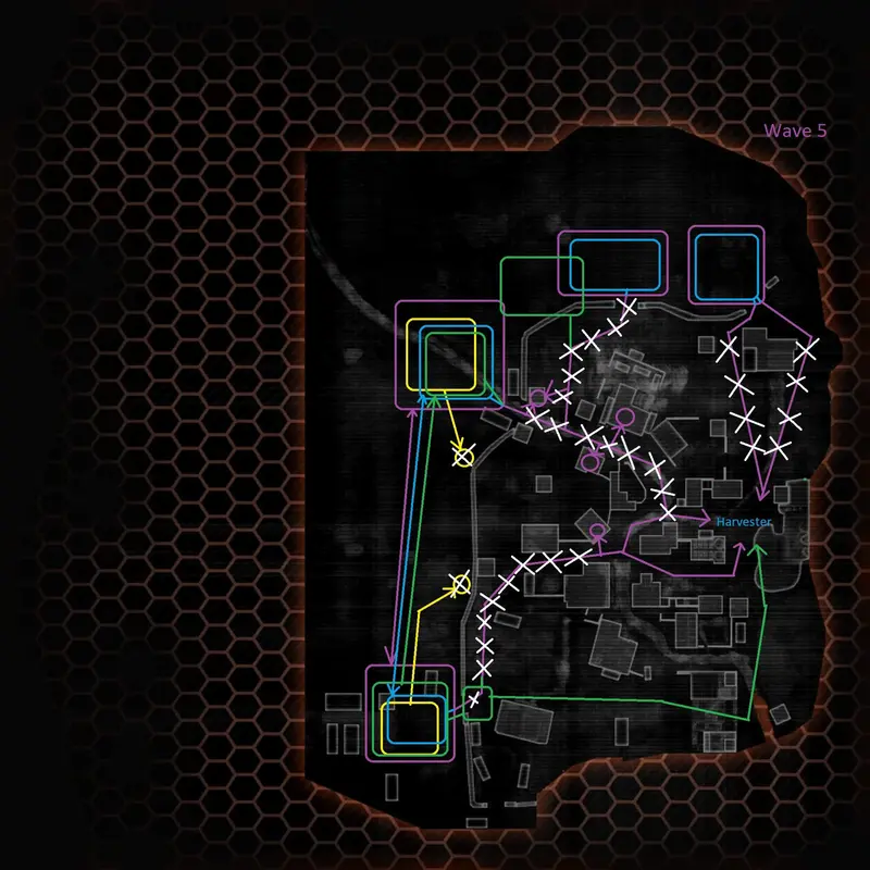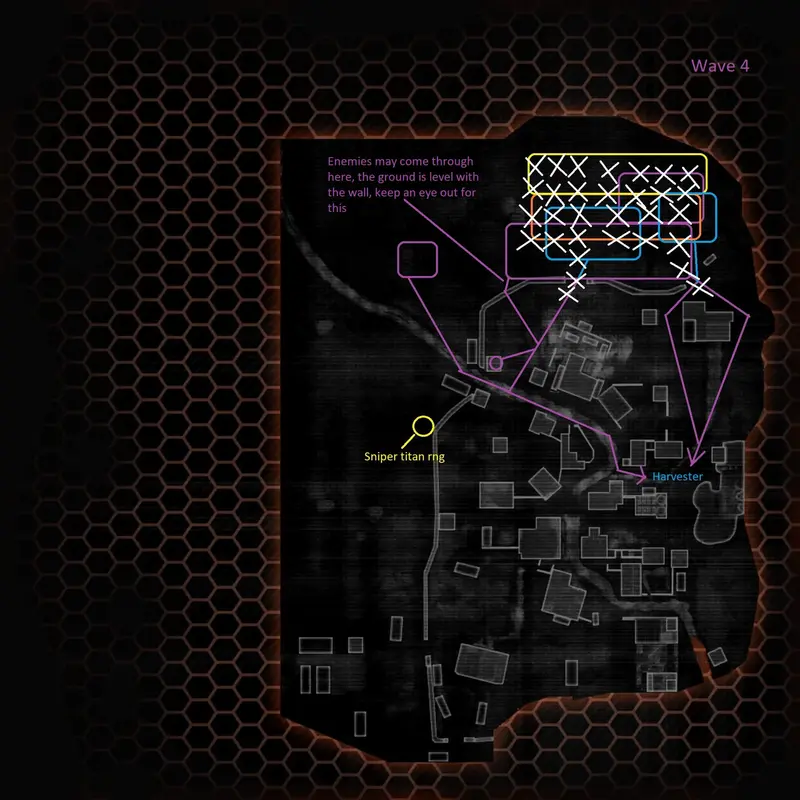 Wave 4 will take the pilots to focus all efforts on the right side chokepoints. The majority of the first wave will be off-angle right choke, then right side choke later on. All arc traps previously placed will now need to be moved to the entire field that is on the right side beyond the wall (As shown in the illustration). The arc traps will make that entire area easier to deal with. This wave will start with a nuke titan and a cloak drone over by deeper mid, this should be taken care of by a lone pilot. The rest of the team will need to hold the choke points, and you guessed it, these choke points have map-deployed smokes on off-angle right and right chokes. If you have a Scorch or Monarch titan, this is the perfect place to defend. This wave is actually pretty easy as all of the enemies that spawn, them being sniper, mortar, Scorch, arc titan, reapers and some other titans all bunch up, perfect for laser core and smart core to deal a massive amount of damage, this area is one of the perfect laser core opportunities as a huge amount of enemies are exposed. Whoever holds the off angle right side will need to be a healthy titan, and must know how to deal with swarms of enemies such as arc titans as they will chip away health fast, the other 2 pilots must assist this pilot by killing any reapers or titans that enter through the area next to the choke that has even level with the wall, keep this in mind at all times. At some point, the smoke dissipates, which you will need to keep an eye out for, as the enemies will fire immediately upon any visible enemy in the smoke. Halfway through the wave some enemies will begin to start running towards the other chokepoint via the short right pathway to harvester, one pilot must hold the right side choke point as to not let any enemies through, it is very important that no enemies leak through, this will make the pilots need to retreat to deal with the enemies that got pasts which will open up other enemies to coming towards the harvester this will compound, if the team gets overrunned then they can hold the titans at mid and short mid but this is never ideal. Now, back to the last parts of the wave, the rest of the enemies will only go towards the right side instead of off-angle right, assuming some people need a new titan. This is the perfect time to titan meter farm, as a few Scorch, nuke, and arc titans will spawn. They will all proceed to walk towards the harvester via the right side. After the last few nukes and arc titan, this wave should be complete. One important thing to note is that there will be a lot of sniper titans, so be careful. Other than that, this wave is an easy win.